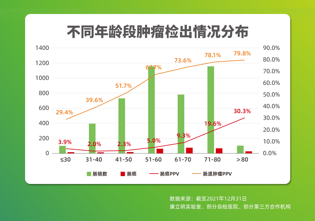 截至2021年12月,作為持續(xù)披露真實(shí)世界應(yīng)用數(shù)據(jù)的腸癌糞便基因檢測(cè)產(chǎn)品,長(zhǎng)安心®共完成33萬例前瞻性應(yīng)用檢測(cè),其中175528例應(yīng)用數(shù)據(jù)可追溯,12114例受檢者長(zhǎng)安心®檢測(cè)結(jié)果陽性(陽性率6.9%),其中4970例長(zhǎng)安心®檢測(cè)結(jié)果陽性的受檢者進(jìn)行了腸鏡復(fù)查(腸鏡依從性41.0%),一共發(fā)現(xiàn)3408例需要治療的受檢者,其中755例腸癌,1444例腺瘤,1209例息肉。長(zhǎng)安心®對(duì)腸道腫瘤的預(yù)測(cè)值(PPV)為68.6%(其中腸癌的陽性預(yù)測(cè)值為15.2%),來自國(guó)家科技部項(xiàng)目的數(shù)據(jù)顯示,長(zhǎng)安心®的陰性預(yù)測(cè)值更是高達(dá)99.9%。