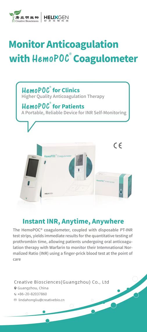 此外,康立明全資子公司好芝生物產(chǎn)品HemoPOC®凝血檢測系統(tǒng)也將亮相此次盛會。HemoPOC®凝血檢測儀是一款便攜式凝血檢測設(shè)備,與配套的檢測卡組成。HemoPOC®凝血檢測系統(tǒng),用于定量測定新鮮指尖毛細(xì)血管血的凝血酶原時(shí)間。該系統(tǒng)操作簡單,滿足即時(shí)檢測及床旁檢測的應(yīng)用需求,增強(qiáng)抗凝管理和慢病管理的有效性。
