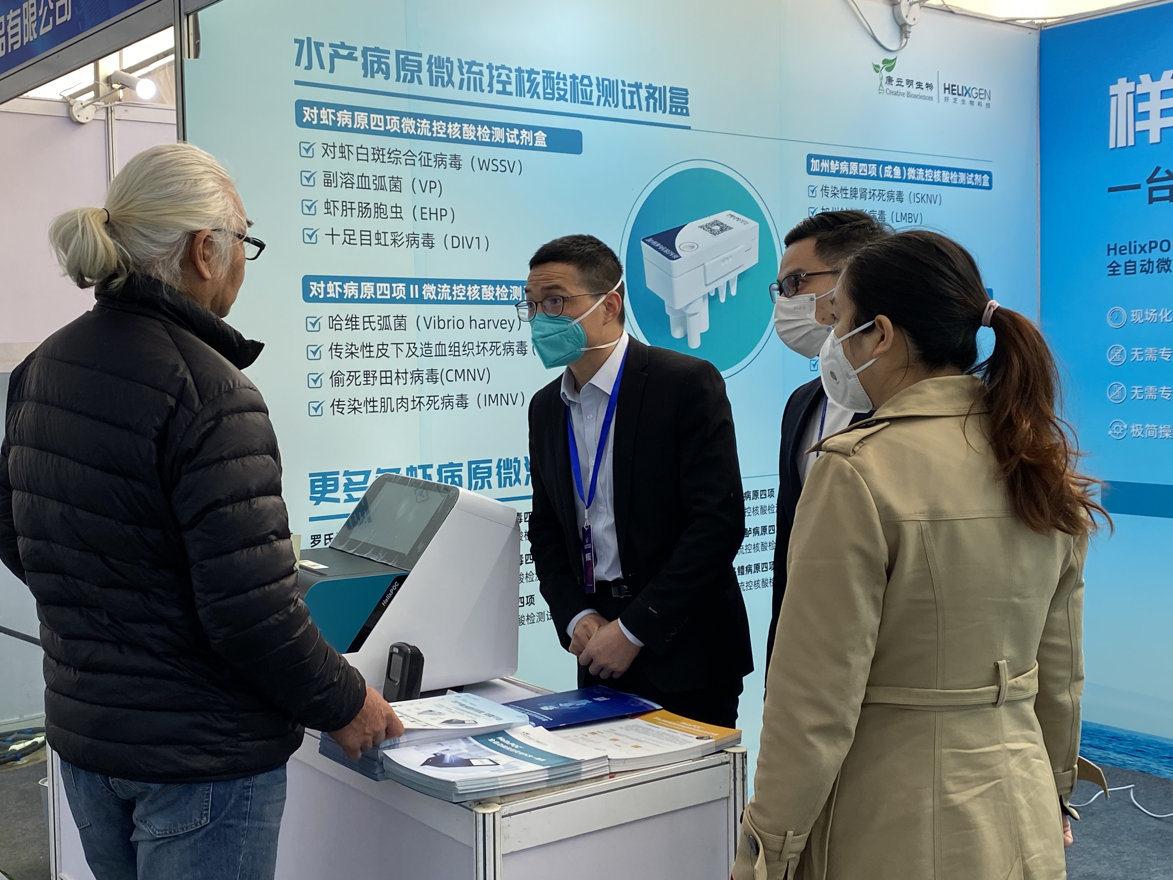 本次展會,康立明生物全資子公司好芝生物攜帶HelixPOC®全自動微流控?zé)晒?/span>PCR一體機及HelixPOC®水產(chǎn)病原微流控核酸檢測試劑盒赴展。