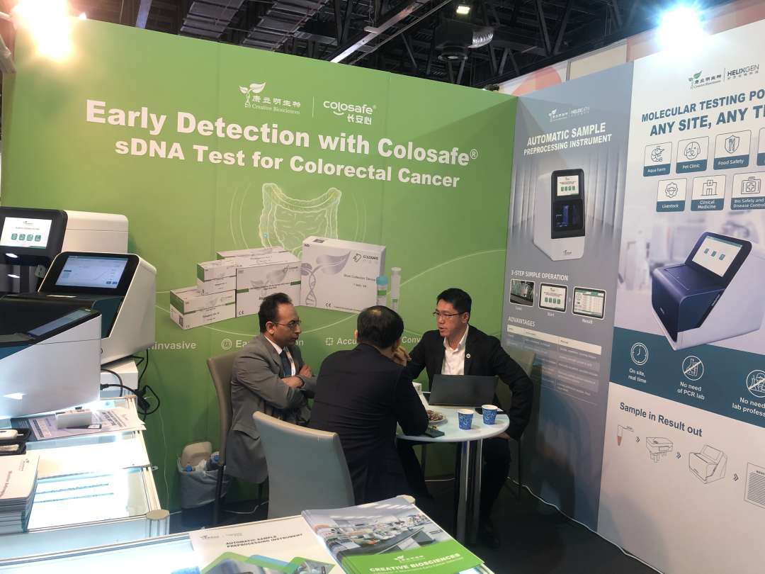 展會上,康立明生物創(chuàng)始人、腸癌早篩技術(shù)發(fā)明人鄒鴻志博士親臨現(xiàn)場,并帶領(lǐng)專業(yè)團(tuán)隊(duì)為多方客戶熱情專業(yè)的講解,共同交流,洽談合作。并介紹了長安心®目前在國內(nèi)568051例應(yīng)用檢測(截至2022年12月31日)的成功模式與經(jīng)驗(yàn)。