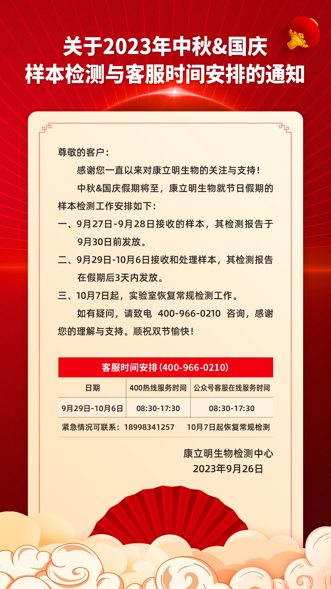 關(guān)于2023年中秋&國慶·樣本檢測與客服時間安排的通知