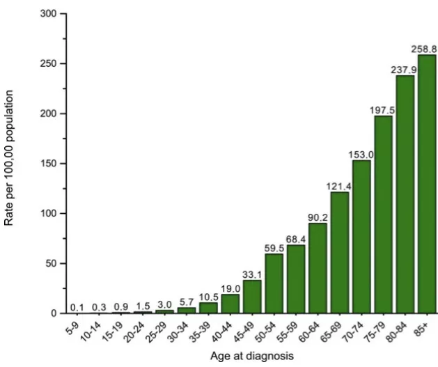 下圖是美國(guó)2012-2016年各年齡段腸癌發(fā)病率數(shù)據(jù),數(shù)據(jù)顯示,55歲以上,每增加5歲,發(fā)病率大約增加30%。