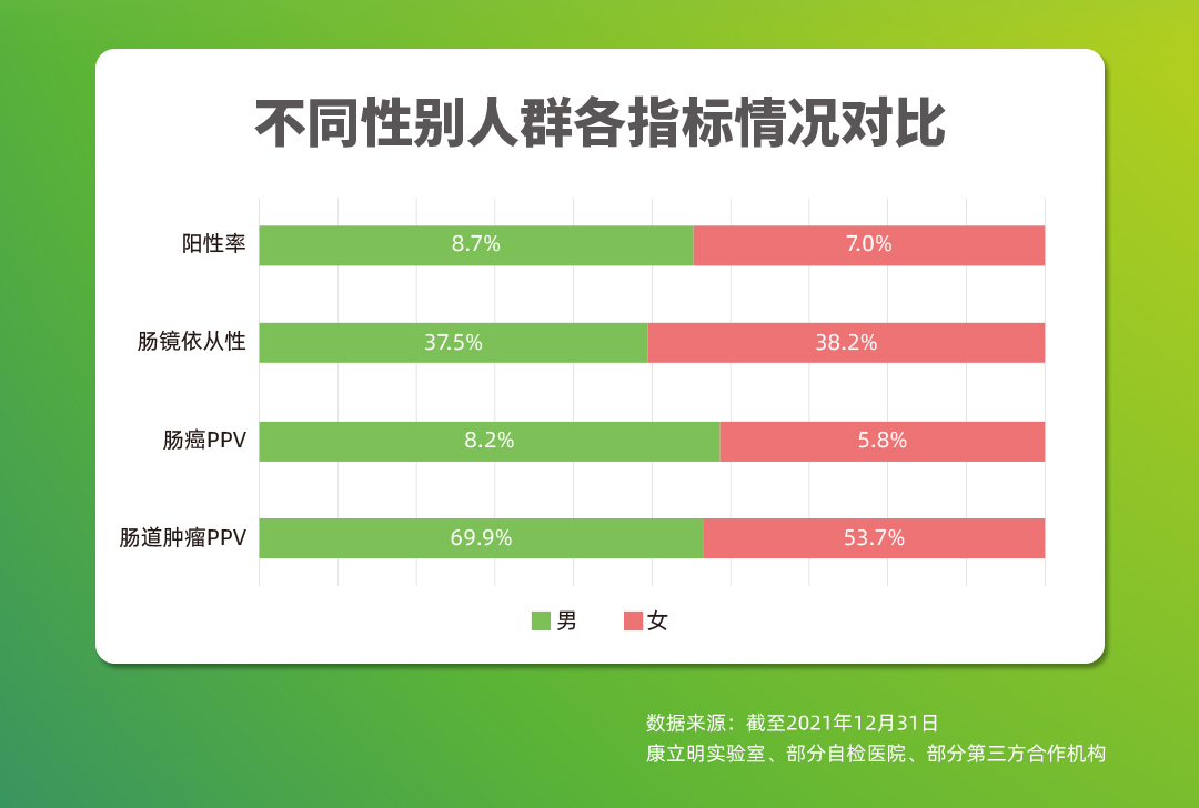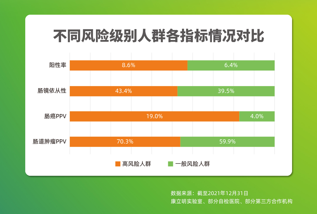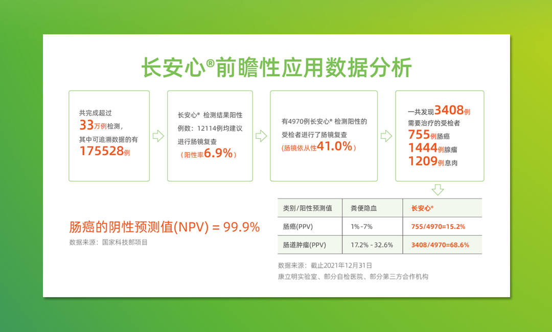 截至202112月,作為持續(xù)披露真實(shí)世界應(yīng)用數(shù)據(jù)的腸癌糞便基因檢測(cè)產(chǎn)品,長(zhǎng)安心®共完成33萬例前瞻性應(yīng)用檢測(cè),其中175528例應(yīng)用數(shù)據(jù)可追溯,12114例受檢者長(zhǎng)安心®檢測(cè)結(jié)果陽性(陽性率6.9%),其中4970例長(zhǎng)安心®檢測(cè)結(jié)果陽性的受檢者進(jìn)行了腸鏡復(fù)查(腸鏡依從性41.0%),一共發(fā)現(xiàn)3408例需要治療的受檢者,其中755例腸癌,1444例腺瘤,1209例息肉。長(zhǎng)安心®對(duì)腸道腫瘤的預(yù)測(cè)值(PPV)為68.6%(其中腸癌的陽性預(yù)測(cè)值為15.2%),來自國(guó)家科技部項(xiàng)目的數(shù)據(jù)顯示,長(zhǎng)安心®的陰性預(yù)測(cè)值更是高達(dá)99.9%。