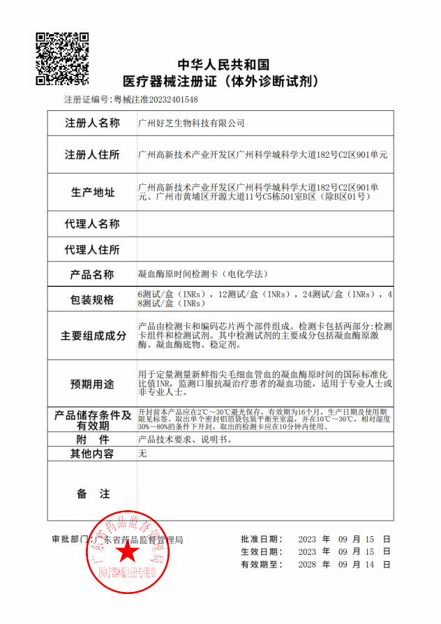 2023年8月2日與9月15日,HemoPOC®凝血檢測儀(HGINR-S)和凝血酶原時(shí)間檢測卡(電化學(xué)法)先后分別取得了廣東省藥品監(jiān)督管理局核發(fā)的醫(yī)療器械注冊(cè)證,獲準(zhǔn)上市!