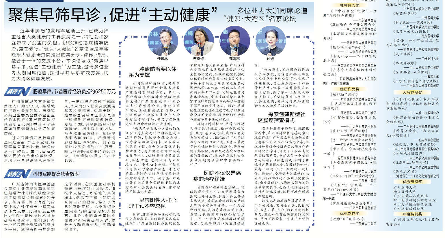 近年來腫瘤的發(fā)病率逐漸上升,已成為嚴(yán)重危害人類健康的主要疾病之一,給社會和家庭帶來了沉重的負(fù)擔(dān)。積極推動癌癥精準(zhǔn)防治,勢在必行。“健識·大灣區(qū)”名家論壇是羊城晚報(bào)大健康研究院推出的集分享、跨界、傳播、融合于一體的交流平臺。本次論壇以“聚焦早篩早診,促進(jìn)‘主動健康’”為主題,邀請多位業(yè)內(nèi)大咖同席論道,探討早篩早診解決方案,助力大灣區(qū)健康發(fā)展??盗⒚魃飫?chuàng)始人鄒鴻志教授受邀出席,并介紹了長安心社區(qū)腸癌篩查創(chuàng)新模式經(jīng)驗(yàn)。